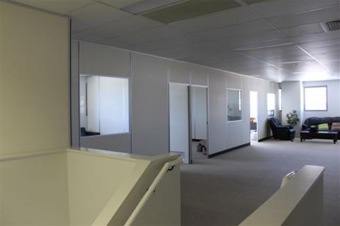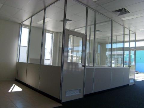 Demountable Office Partitions offer numerous advantages. With so much versatility panels can be relocated to a new location in minimal time, no-fuss installation and all panels are prefabricated. Standard system is clear anodised aluminium framing, vinyl clad 10mm plasterboard, skirting is 100mm x 6mm satin black polyester paint over hardboard. All glazing is to Australian Standards, doors are 2040mm x 920mm wide flush panels. Other options available: Powder-coated framing and aluminium skirting, grey tinted or frosted glass, return Air Grilles fitted to doors. Partions are available in both solid panel and glass panel combinations.