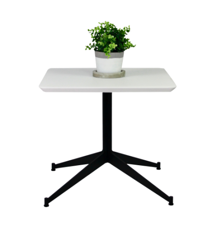 25mm thick matte white painted MDF square top with shark nose edge, modern laser cut steel leg frame powder coated black.