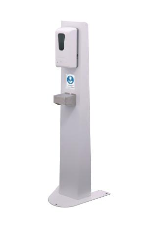 *White Powdercoated Stand is easy to assemble, is durable & can be easily mounted to the floor or left as a portable station. Does not require main power or plumbing. Drip Tray can also be used as a shelf for Pump Sanitiser Bottles. Lifetime warranty on the stand.