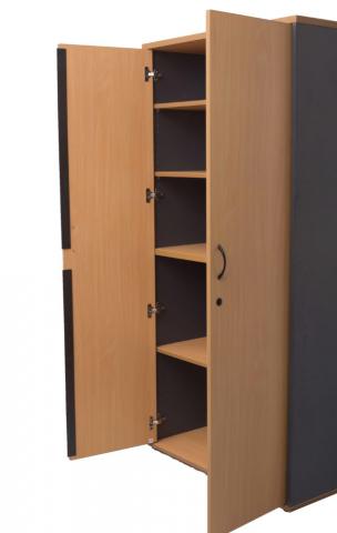 1 x Fixed middle shelf & 3 x adjustable 25mm shelves, lockable, soft close hinges, 25/18mm E1 Enviro board, black bow handles.