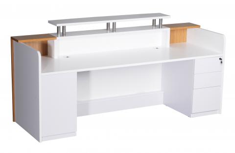 Gloss White Reception Counter with Zebra Veneer Columns and Glass Top. Built in 3 Drawer Pedestal & Built in CPU and Storage Cupboard in E1 Commercial Melamine Board, 2 x Chrome Cable Entry Hole Covers with Brush Insulators in Desk Top. 5 Year Commercial Warranty.