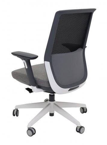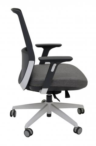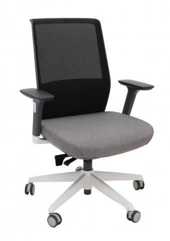 Elegant medium back mesh task chair. Black mesh back rest with light grey seat, light grey concealed lumbar cushion. 3D Adjustable arm rests. White powdercoated aluminium 5 star base on castors
