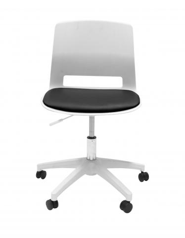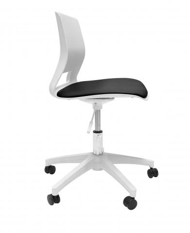 White flexible polypropylene shell, black PU seat pad and white nylon 5 star base, height adjustable.
