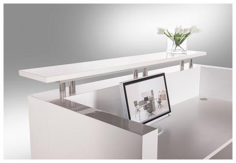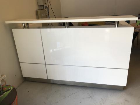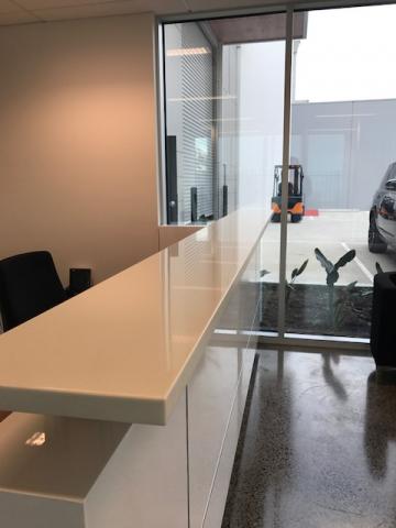 Counter body in jade white 2 pack finish with feature aluminium strips & stainless steel kick plate. Desk matt white melamine desk top, jade white Caesar stone hob supported by chrome pillars.