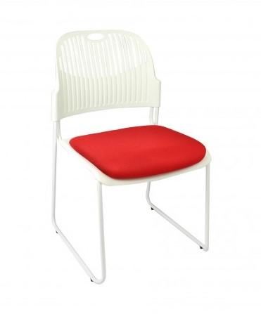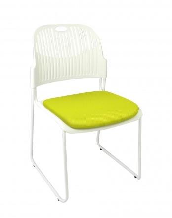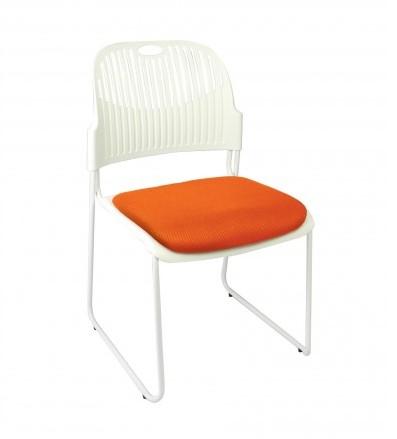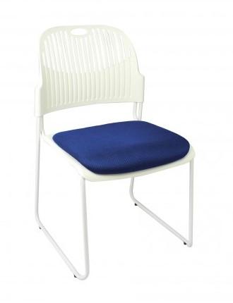 Ergonomically curved seat and back with soft flex for comfort. Comes in a black powdercoat frame with black polypropylene back or white powdercoat frame with white polypropylene back. Upholstered seat pad in a range of colours. Stackable to 10 high. Frames are linkable. 6 year commercial warranty.