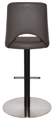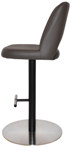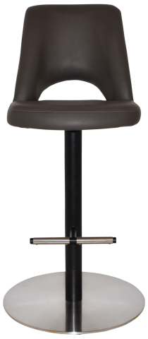 #201 Stainless Steel disc base & footrest, black mild steel column. High density foam shell upholstered in commercial grade black vinyl as standard or custom option available in a large choice of commercial grade fabrics or vinyls.