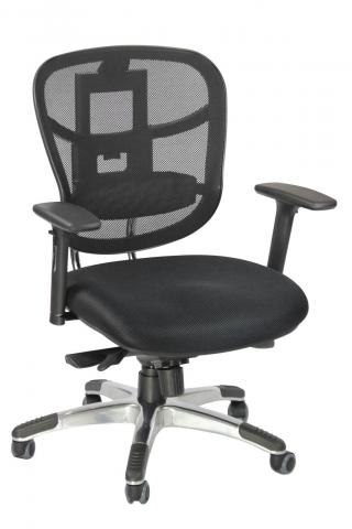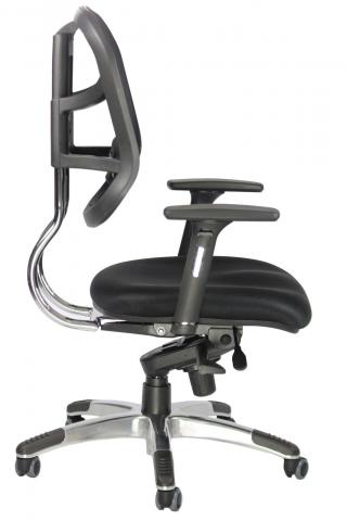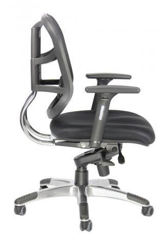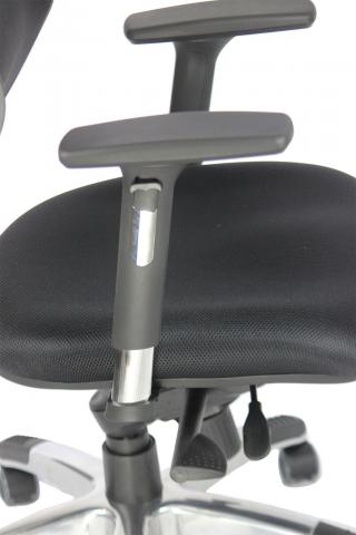 Height and width adjustable arms with swivel, mesh back is height adjustable by ratchet, synchronised knee tilt mechanism with seat slider and foam moulded seat, comes standard with arms. Polished metal frame and base with rubber castors.