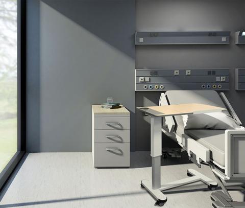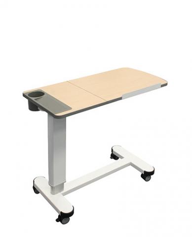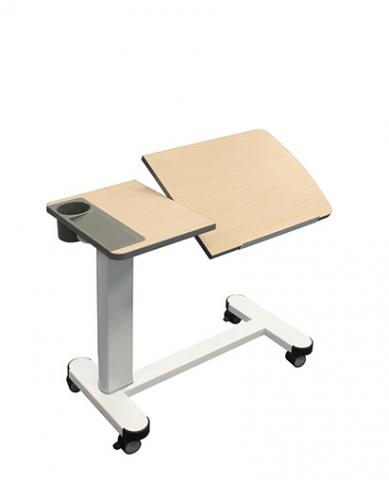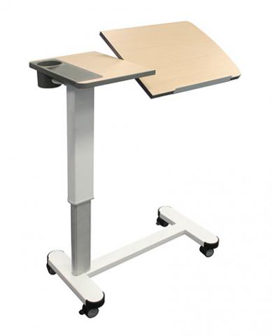 Highly versatile and stylish overbed patient table. Split tilt-top surface with adjustable angle laptop shelf with cup holder and tray-tidy.