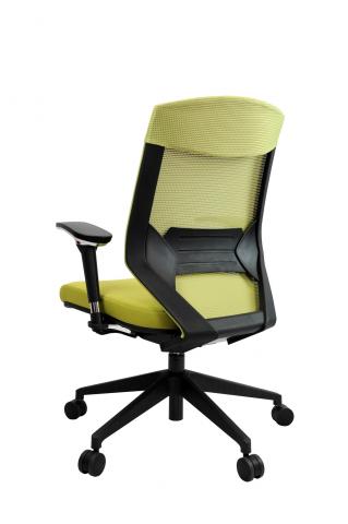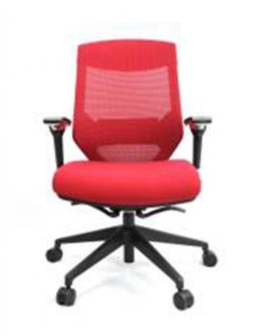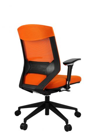 Auto tension adjustment allows adjusts according to user’s weight, infinite locking system, height and angle adjustable armrest, height adjustable lumber support, medium back, black frame, Nylon base, fabric seat.