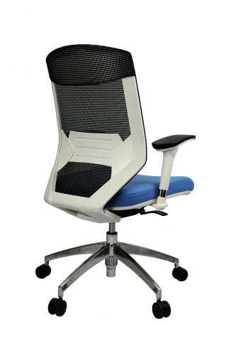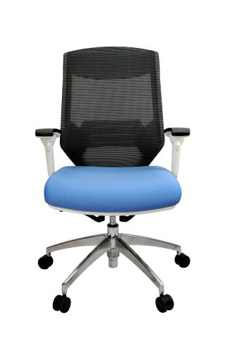 Auto tension adjustment allows adjusts according to user’s weight, infinite locking system, height and angle adjustable armrest, height adjustable lumber support, medium back, white frame, Nylon base, fabric seat.